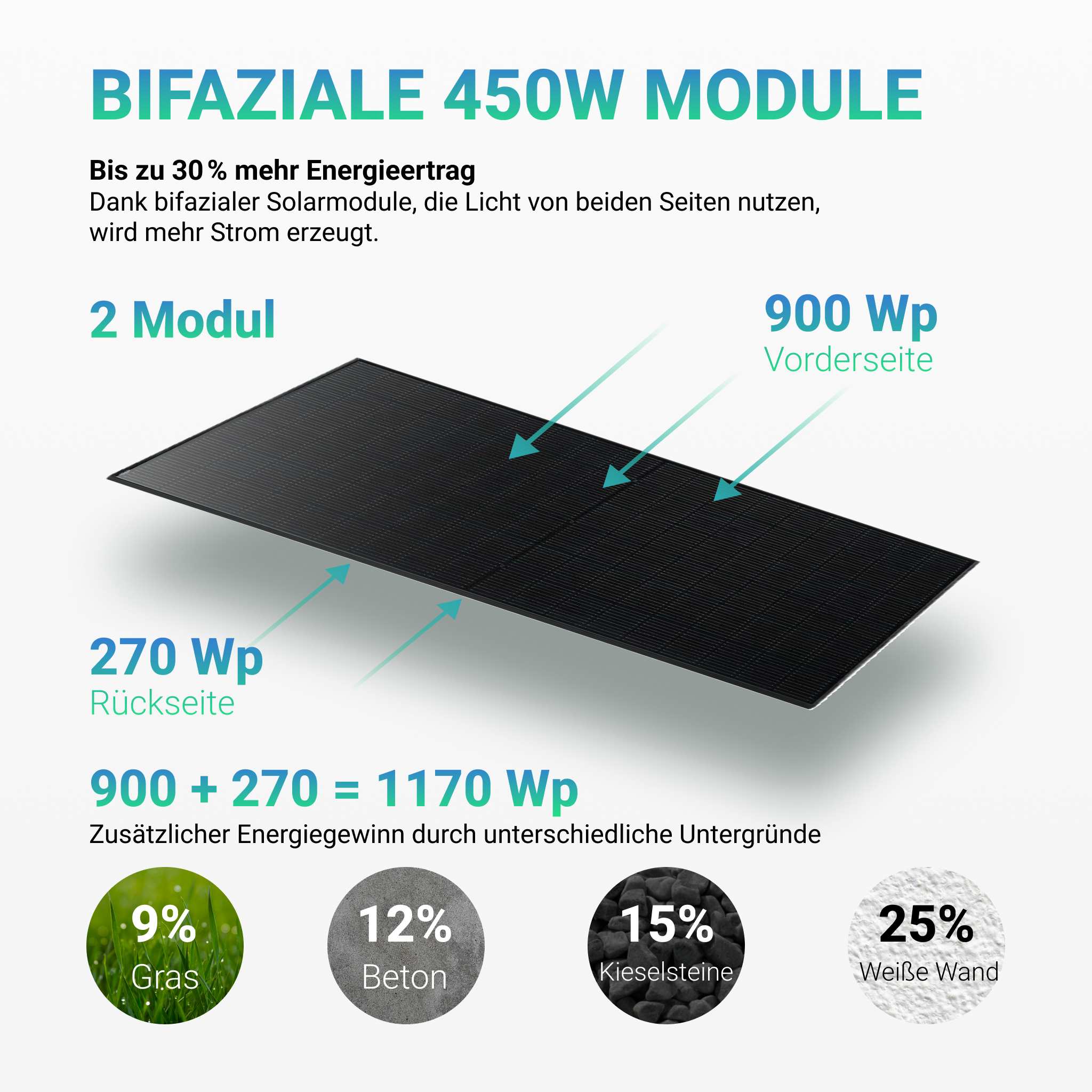 Durch die bifaziale Auslegung erzeugt das Modul auch auf der Rückseite Strom – perfekt für optimale Energieausbeute unter verschiedensten Installationsbedingungen.