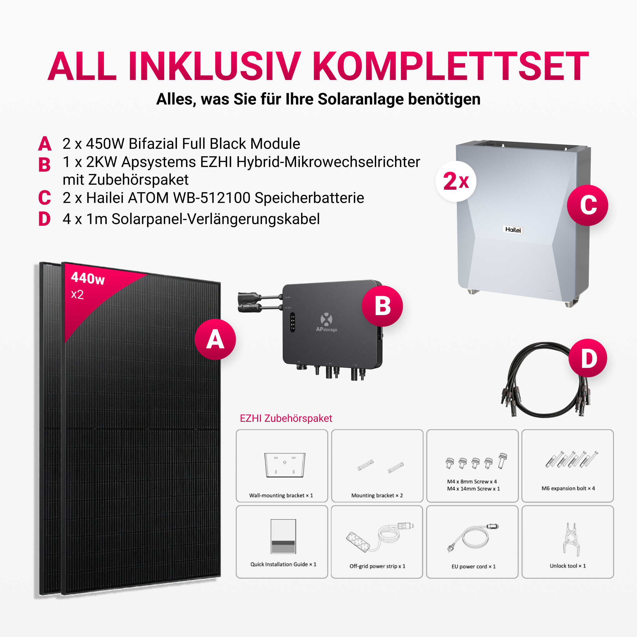Dieses Komplettpaket bietet das zuverlässige Hailei ATOM WB Set mit 5 kWh Speicher und Wechselrichter, kombiniert mit 2 mal Bifacial Glas Full Black PV Modul – ideal für Eigenheime und Balkonkraftwerke. Eine perfekte Lösung für eine kosteneffiziente und unabhängige Energieversorgung!