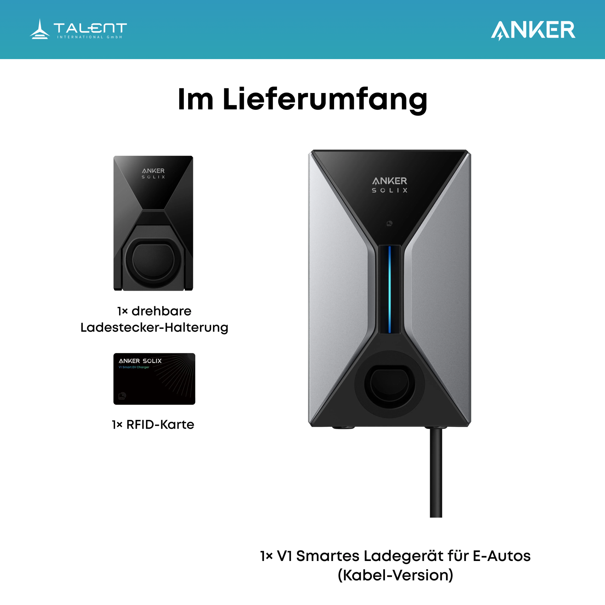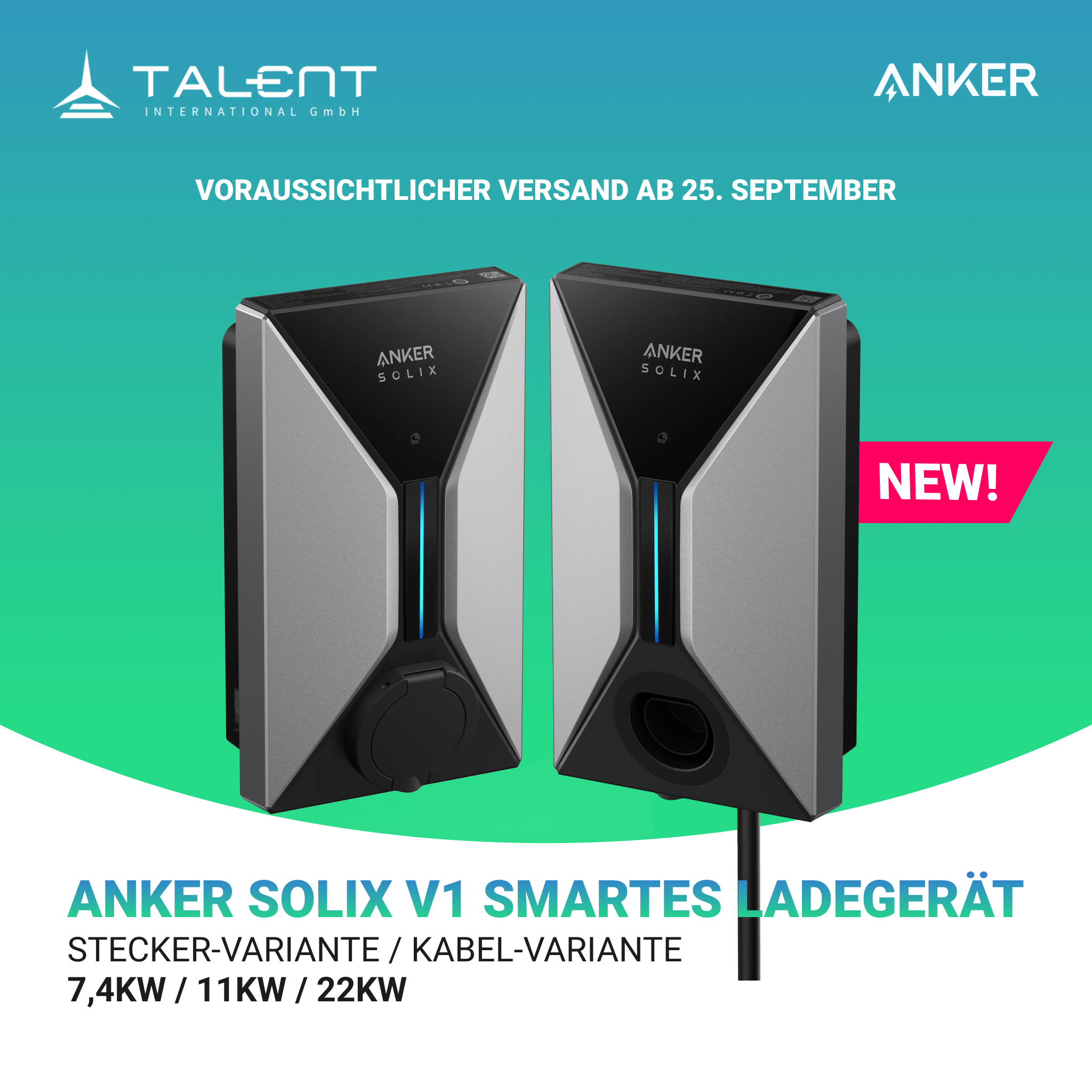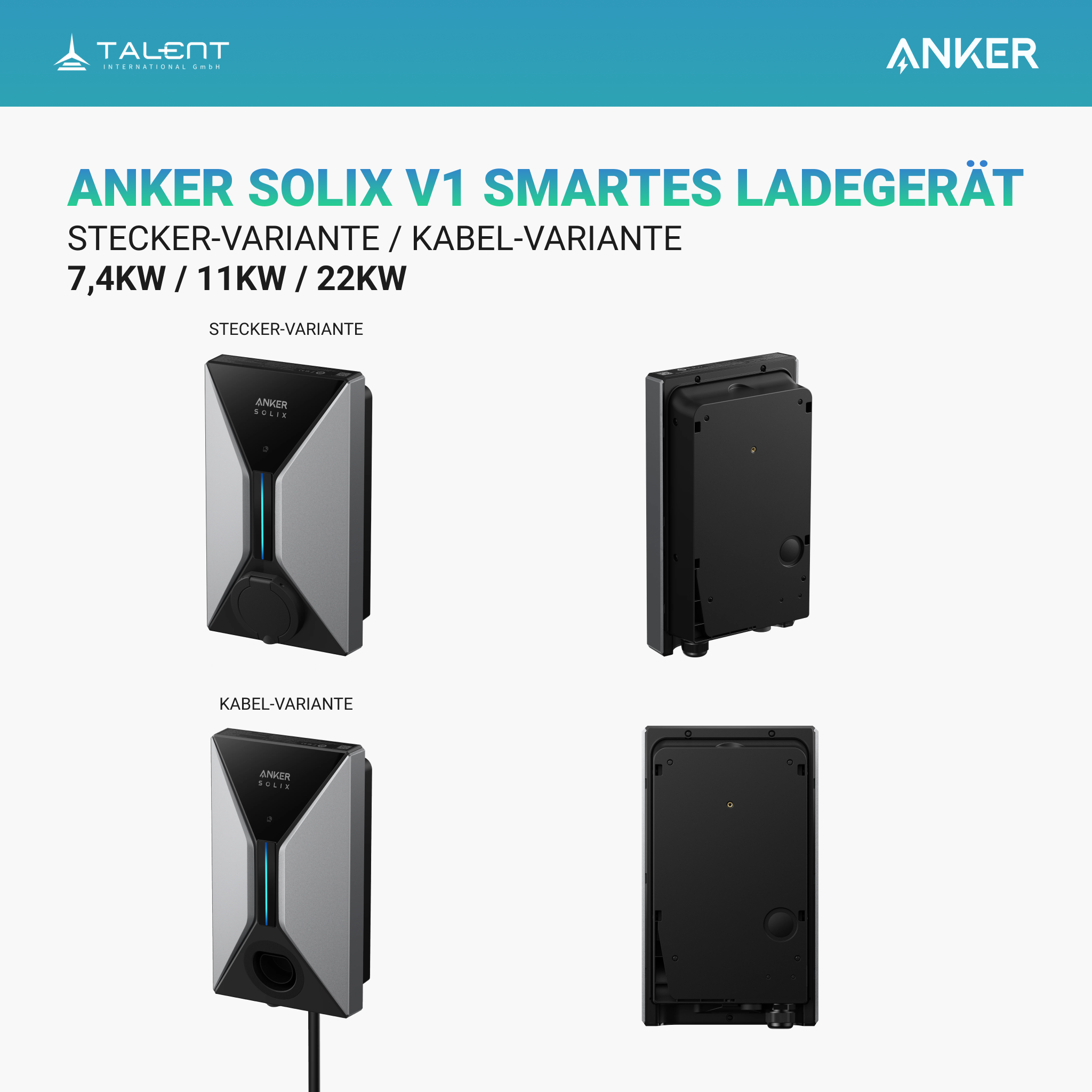 Der Anker SOLIX V1 ist in zwei Versionen erhältlich: Kabel und Steckdose. Beide Versionen sind in den Leistungsstufen 7,4kW, 11kW und 22kW verfügbar. Die Steckdosen-Version wird ohne Ladekabel geliefert.