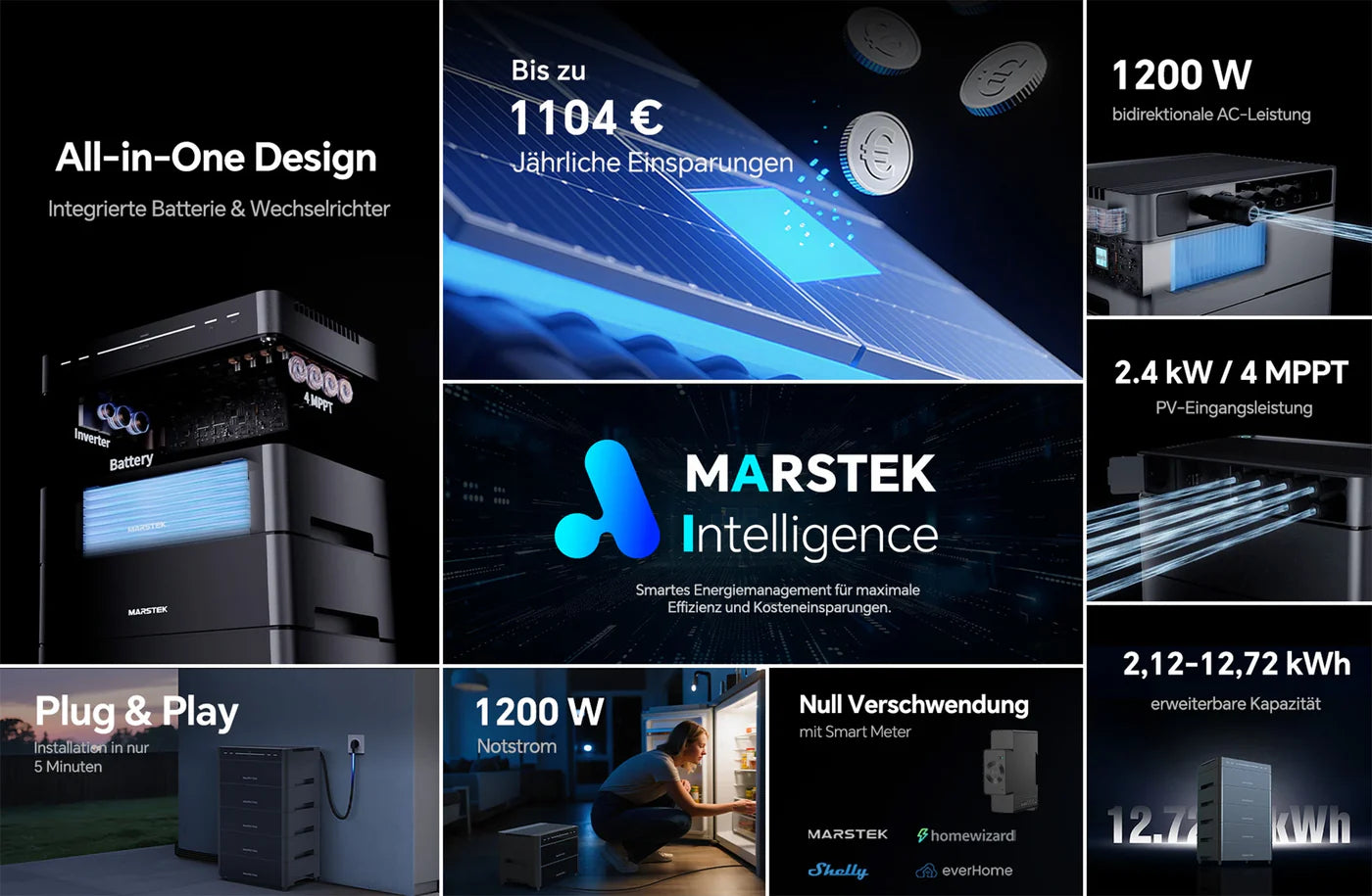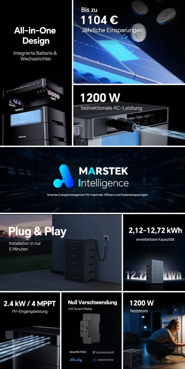 Solarenergieerfassung, Speicherung und Nutzung werden in einem kompakten Gerät vereint – ohne separate Komponenten. Der integrierte Mikro-Wechselrichter wandelt Solarstrom direkt in nutzbaren Wechselstrom um, spart Installationsschritte und optimiert die Energieeffizienz.