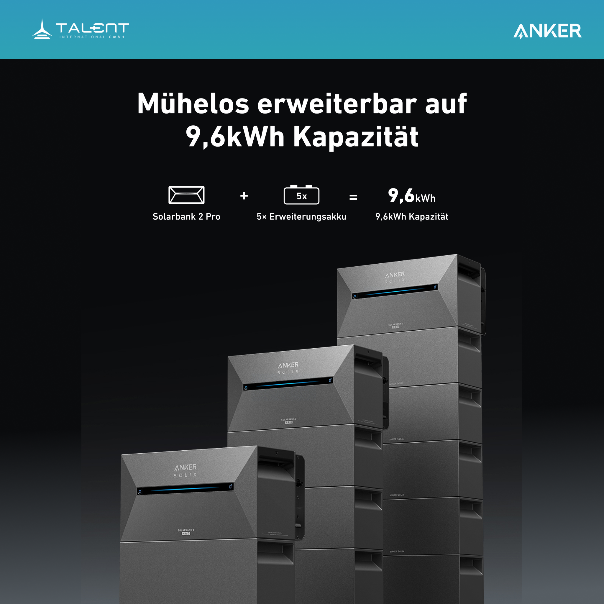 Erweiterungsakku mit 2,7 kWh Speicherkapazität. Erweiterbar auf bis zu 16 kWh. Kompatibel mit Batteriespeichern der Reihen Solarbank 2 und 3.