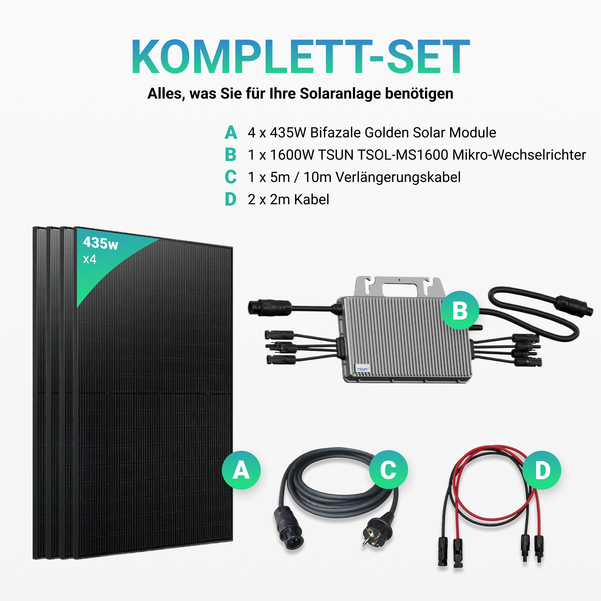 1x 5m Verlängerungskabel. Mit diesem Verlängerungskabel können Sie die Solarmodule so platzieren wie Sie möchten. Das Kabel wurde in einer deutschen Werkstatt konfektioniert und hat Premium-Qualität.