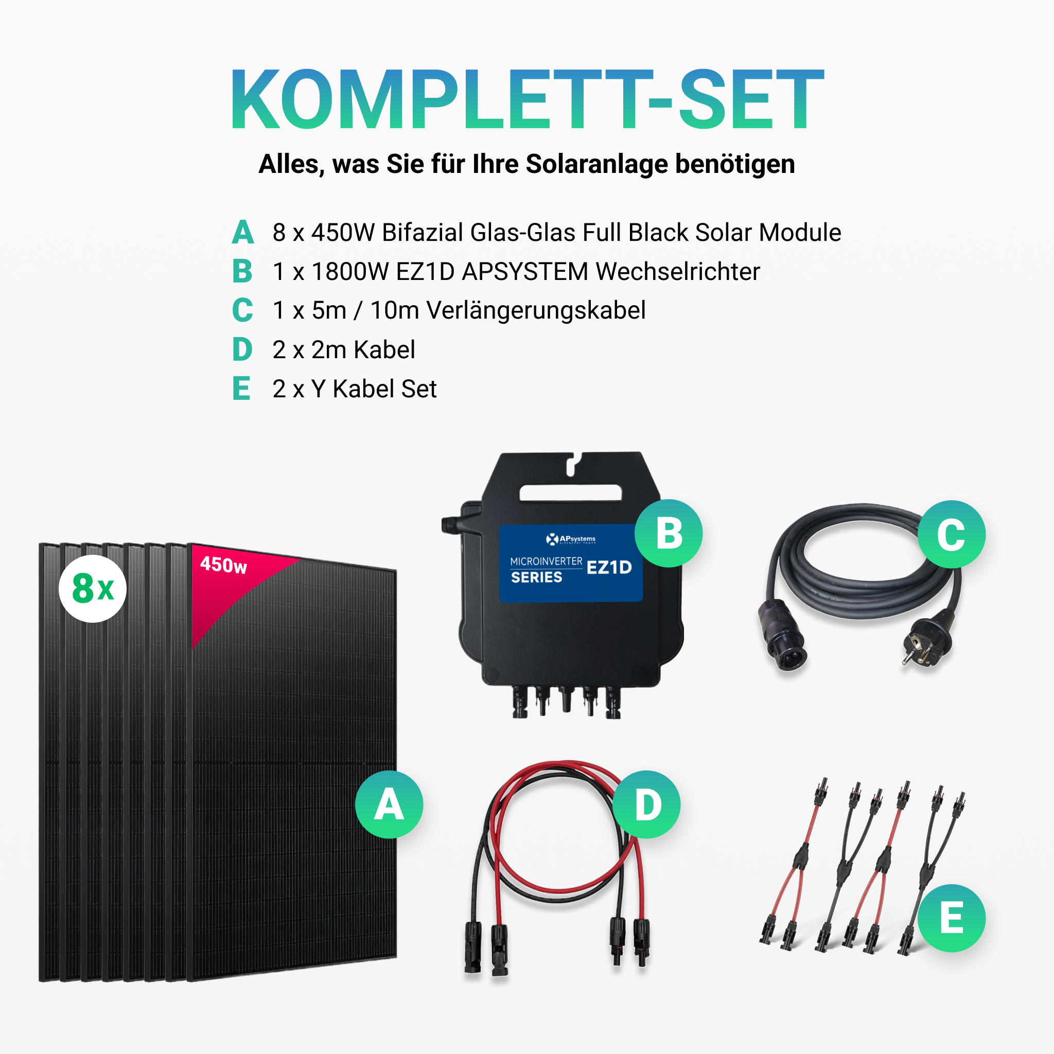 1x 5m Verlängerungskabel. Mit diesem Verlängerungskabel können Sie die Solarmodule so platzieren wie Sie möchten. Das Kabel wurde in einer deutschen Werkstatt konfektioniert und hat Premium-Qualität.