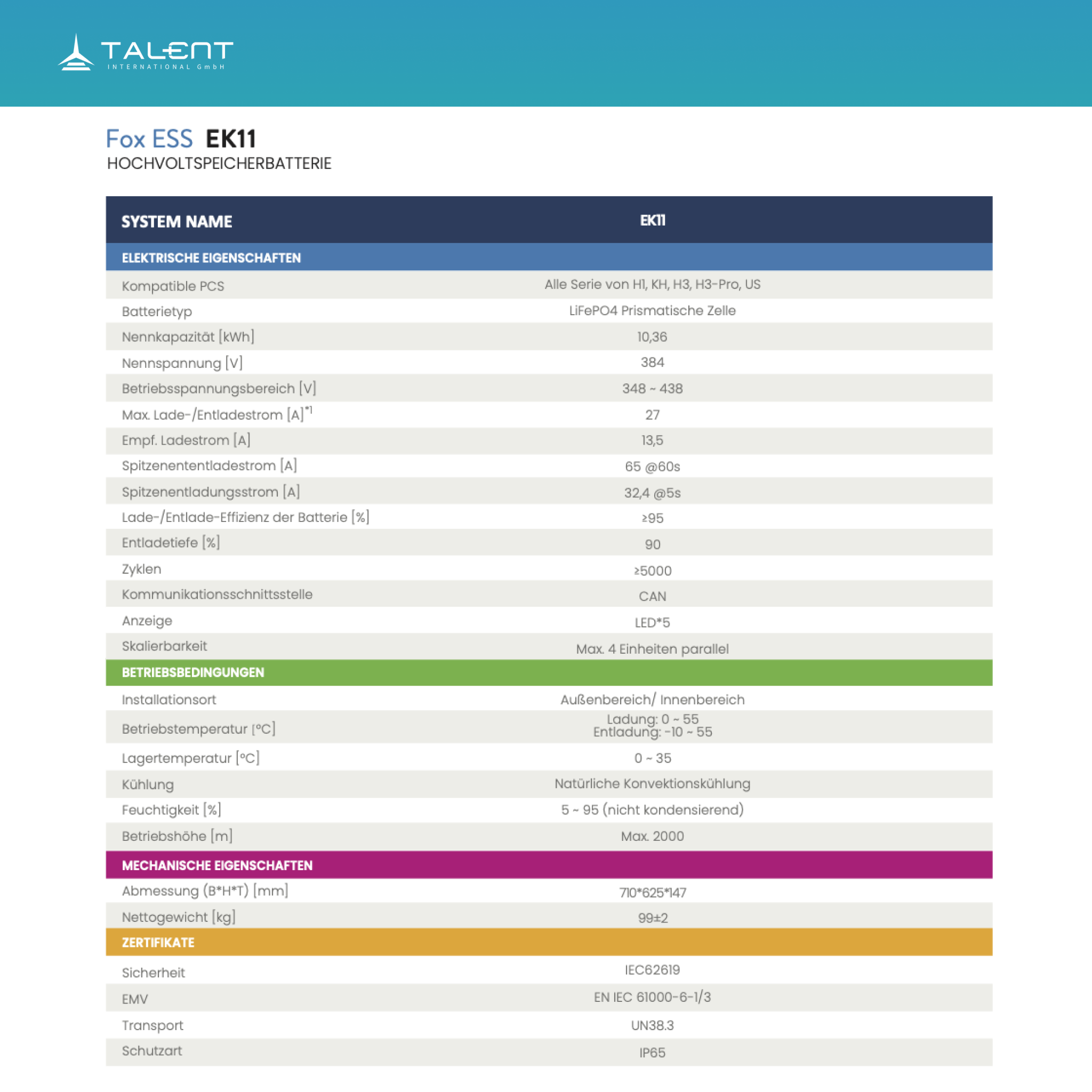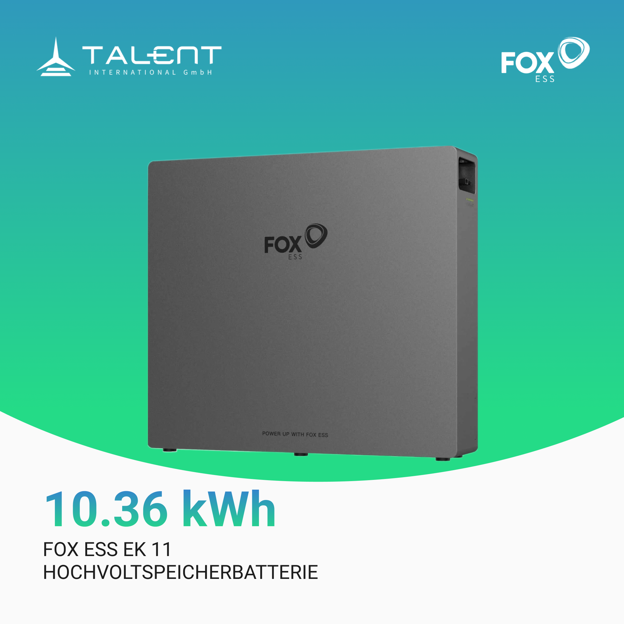 Der Fox ESS EK11 Batteriespeicher bietet eine effiziente und zuverlässige Lösung zur Energiespeicherung und -verwaltung. Mit einer Kapazität von 10,36 kWh eignet er sich ideal für mittlere bis große Solaranlagen in privaten Haushalten sowie gewerblichen Anwendungen. Seine hybride Funktionalität und hohe Effizienz maximieren die Nutzung von Solarenergie und bieten gleichzeitig Notstromversorgung für kritische Lasten.