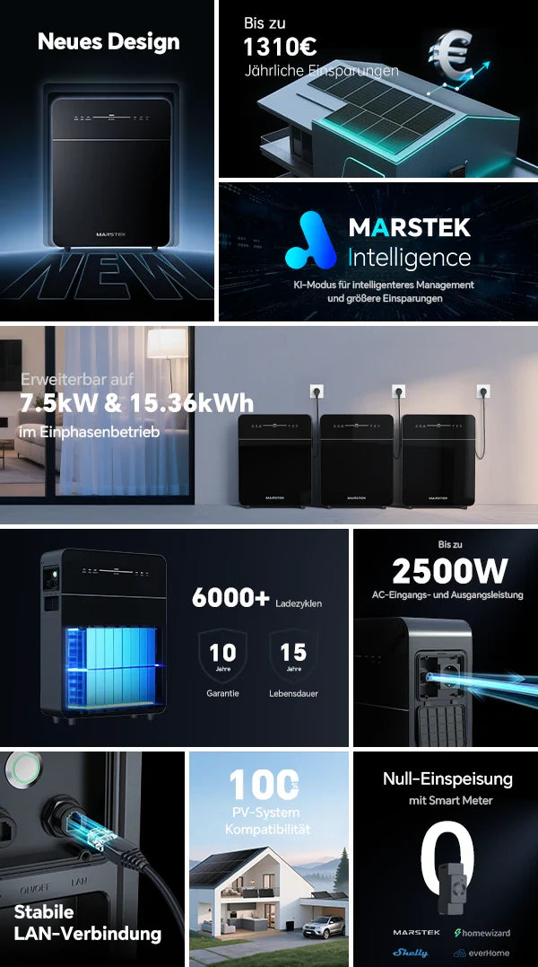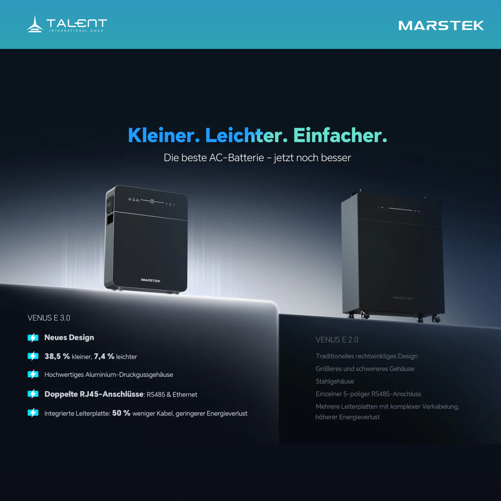 Das Marstek Venus E Gen 3.0 ist ein leistungsstarkes und flexibles AC-gekoppeltes Energiespeichersystem für Haushalte mit bestehenden PV-Anlagen. Mit 5,12 kWh Speicherkapazität (erweiterbar auf 15,36 kWh) und bis zu 2,5 kW AC-Leistung bietet es intelligente Energieverwaltung, Notstromversorgung und maximale Eigenverbrauchsoptimierung.